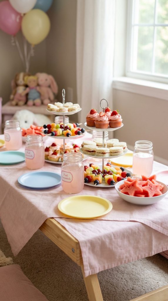 The food table is honestly where Barbie parties really come alive. Think pink lemonade, strawberry cupcakes with sparkly frosting, and watermelon cut into star shapes.