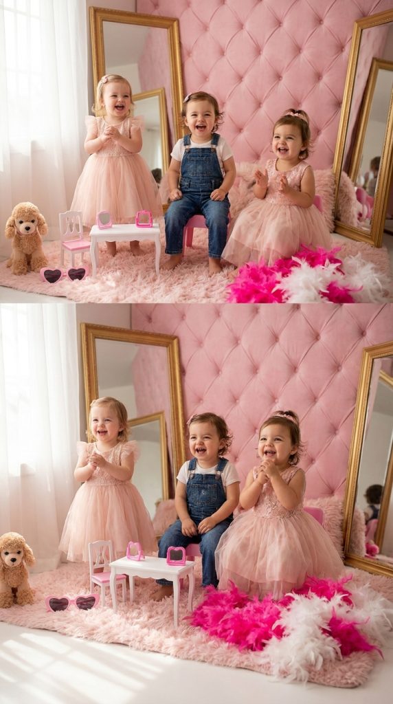 Grab a dollhouse backdrop featuring Barbie’s iconic pink interiors, then scatter mirror props around the space for that glam, signature Barbie aesthetic.