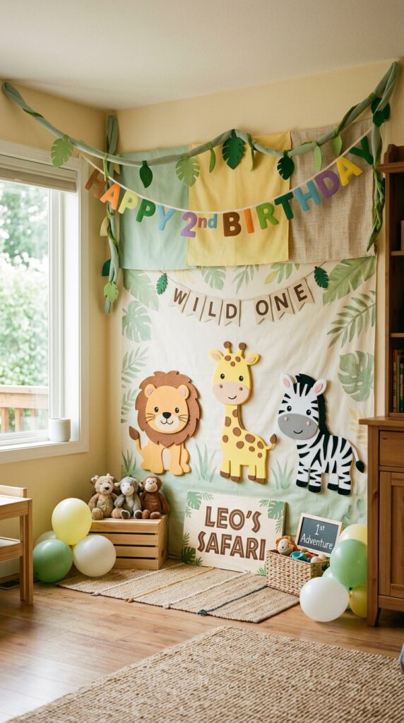 Every great safari party needs an epic backdrop, and creating one that’s toddler-safe is easier than you might think. Skip real plants and opt for fabric jungle vines you can drape safely overhead, well out of grabbing reach.