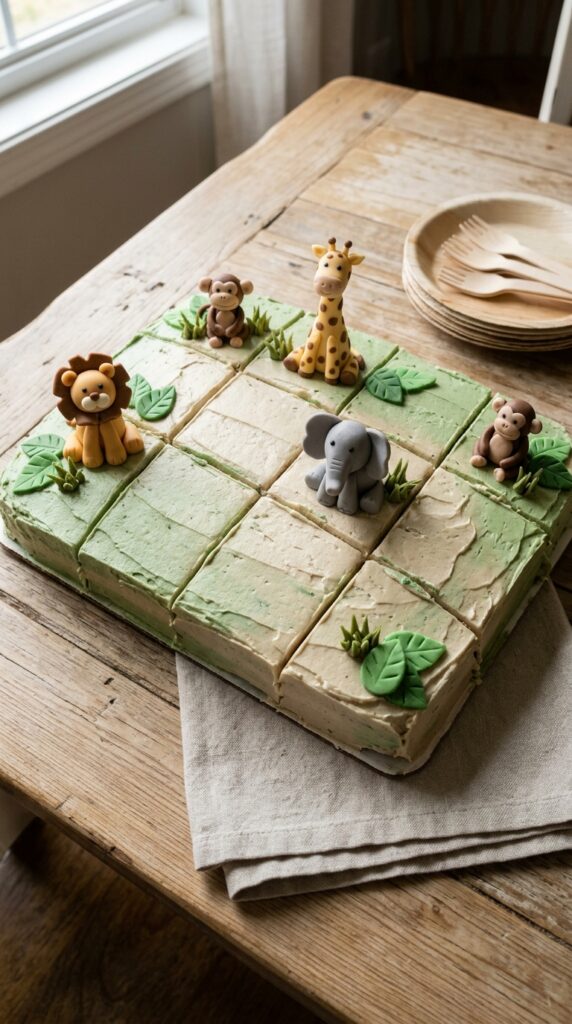 A sheet cake gives you slicing ease, letting you cut uniform squares quickly without juggling layers. Jungle animal toppers from Wilton work great and stay safely positioned.