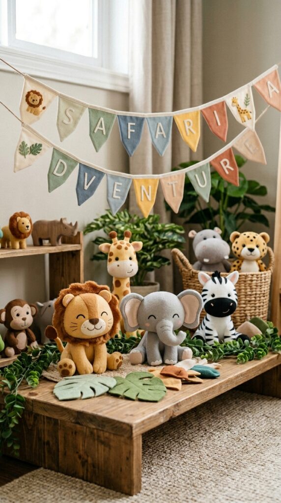 For table displays, pair small animal figurines with greenery to create a safari centerpiece that feels inviting rather than intimidating.