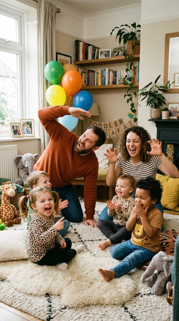 Try animal charades by acting out safari creatures like elephants, lions, and giraffes. Toddlers absolutely lose it watching adults stomp around pretending to be elephants—trust me on this one.