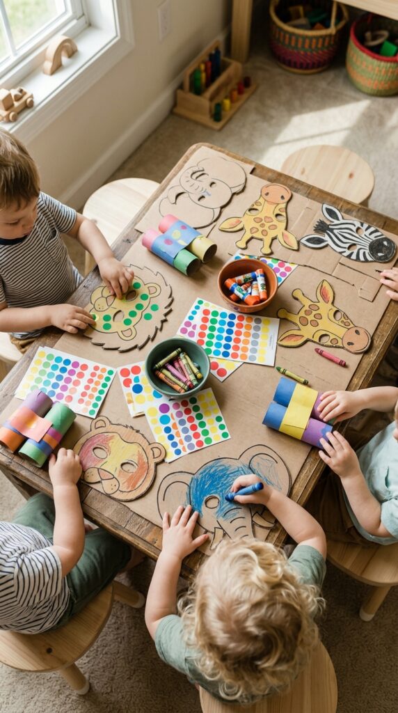 Set up a simple station where kids decorate pre-cut animal masks using chunky crayons and sticker dots — no scissors needed.