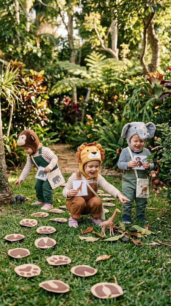 For a more structured activity, consider organizing a simple safari scavenger hunt where toddlers search for hidden animal figures or picture cards around the party space.