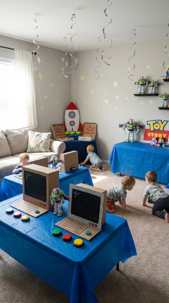 For authentic space themed decor, hang silver streamers from the ceiling and scatter glow-in-the-dark stars on walls. Place Buzz Lightyear figures strategically around your setup—they’ll become natural photo opportunities that parents absolutely love capturing throughout the party.