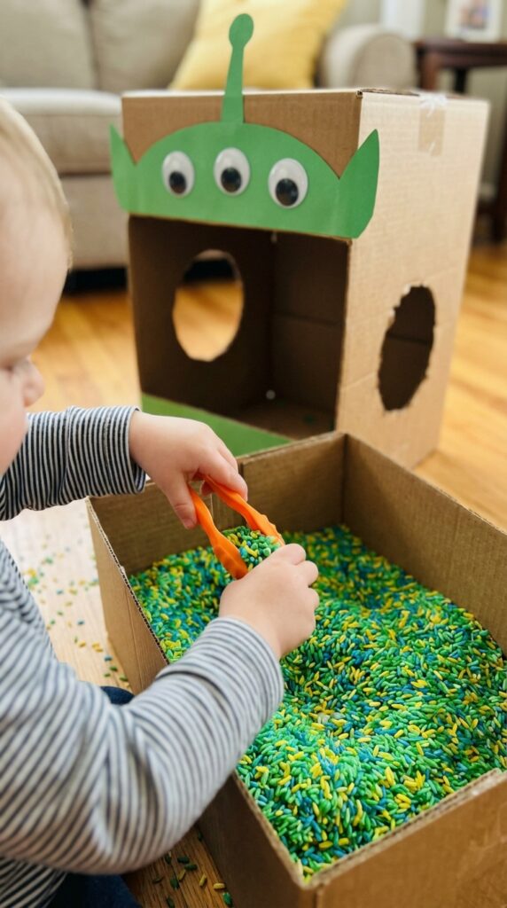 Transform a large cardboard box into your own “claw machine” filled with simple sensory textures. Toss in colorful rice, foam balls, and small Alien toys for toddlers to uncover. Cut arm holes in the sides so kids can reach in blindly and grab treasures.