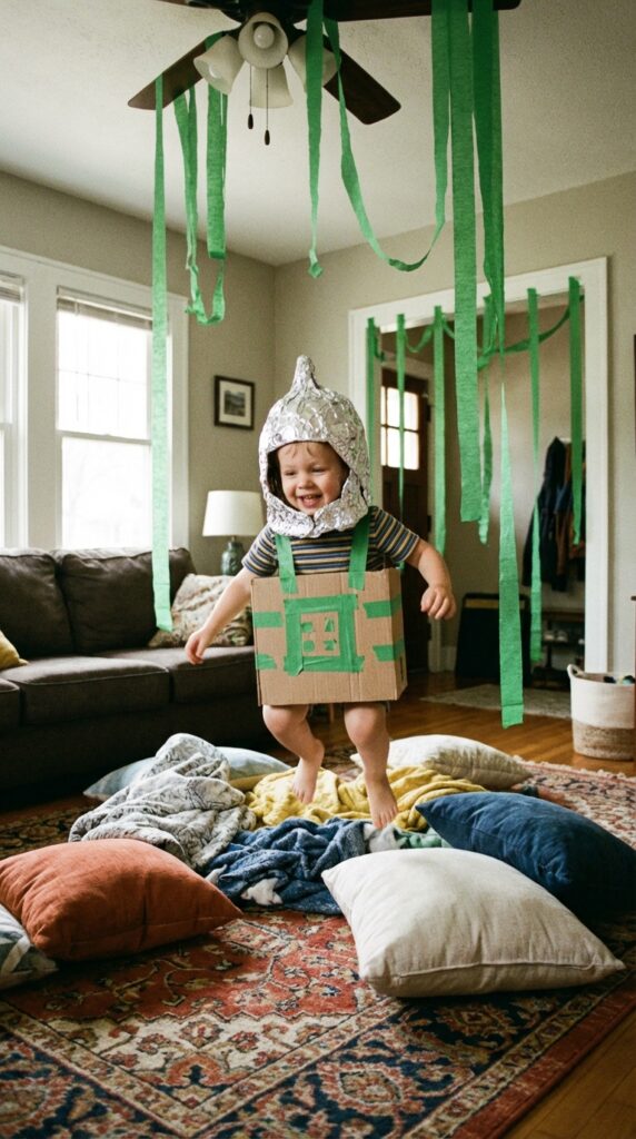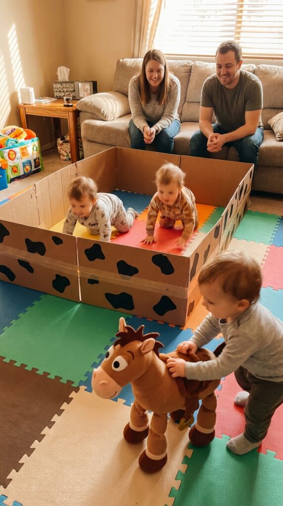 Start with “Woody’s Roundup,” where toddlers crawl through cardboard box “corrals” you’ve decorated with cow spots. Trust me, they’ll love it more than any expensive entertainment.