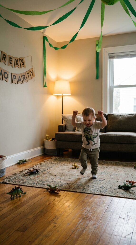 Create dinosaur skeleton displays using white pool noodles cut into bone shapes and taped to your walls. I’ve found that dollar store plastic dinosaurs scattered around add instant Jurassic vibes.