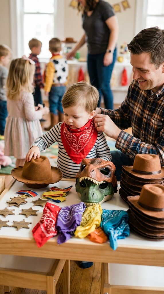 You can create custom character costumes using basic materials. Think sheriff badge stickers for Woody wannabes, plastic dinosaur masks for Rex fans, and colorful bandanas for everyone. I recommend setting up low tables where little hands can easily grab accessories.