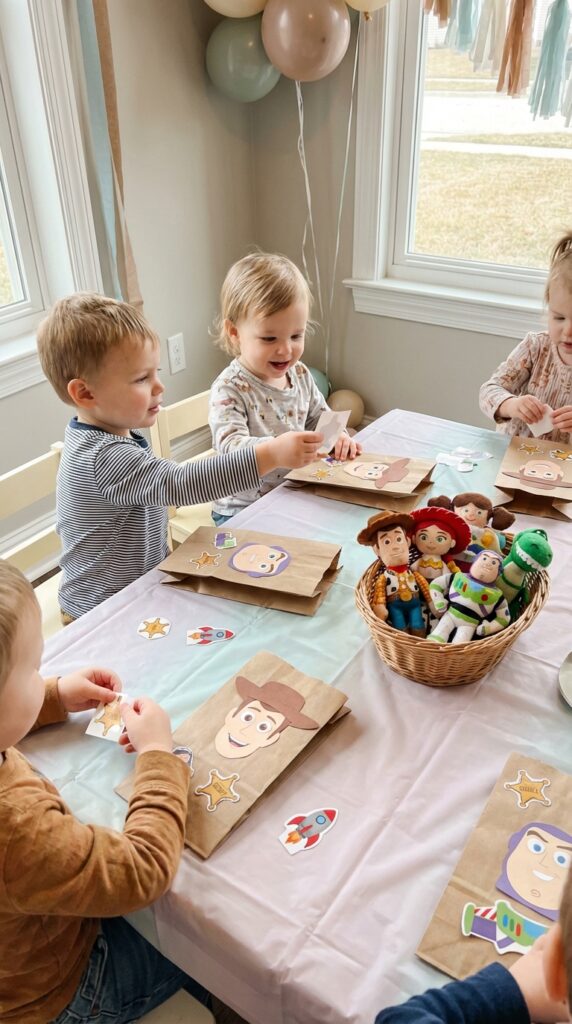 Paper bag puppets make perfect toddler-friendly favors—they’re simple, safe, and spark imagination. Pre-cut Woody and Buzz faces from construction paper, then let kids stick them onto brown lunch bags. Trust me, even two-year-olds can handle basic sticker placement!