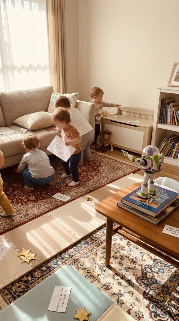 Create a simple “Rescue Woody” expedition by placing toy story characters around your party space. Start with Buzz announcing that Woody needs help, then guide toddlers to find hidden clues like cowboy hats or sheriff badges.