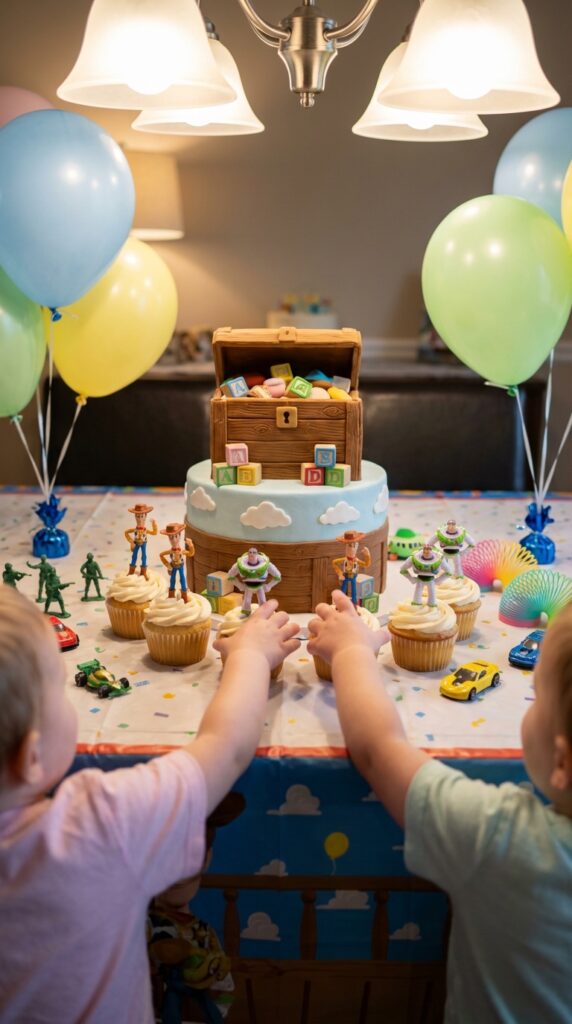 Organize a character dress up station near your main party area. Include cowboy hats, space ranger arm bands, and pig ears for Hamm enthusiasts. Trust me—watching toddlers morph into their heroes creates the most authentic giggles you’ll hear all day.