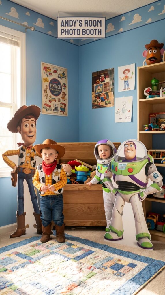 Start with blue paint or fabric for the walls, then add Andy’s signature cloud wallpaper border. You’ll create colorful backdrops by hanging toy posters and adding a toy chest prop. Include themed photo props like cowboy hats, space ranger helmets, and cardboard cutouts of Woody and Buzz.