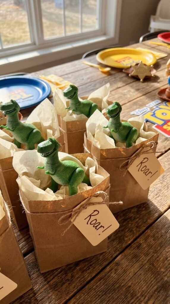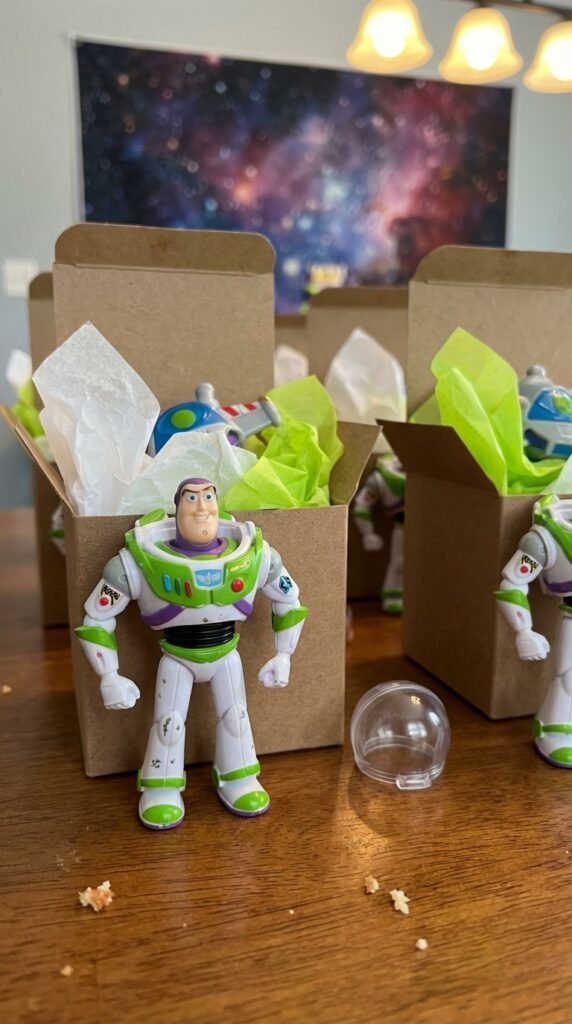 Complement these with alien spaceship crafts using small UFO toys or glow-in-the-dark space themed items. Three-eyed alien figurines work beautifully too. These space-themed favors capture Buzz’s “to infinity and beyond” spirit perfectly.