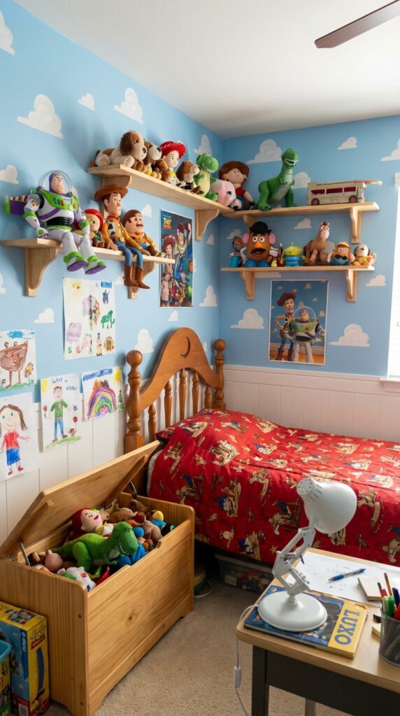 Create imaginative toy storage using cardboard boxes labeled “Andy’s Toys.” Stack them at different heights for visual interest.