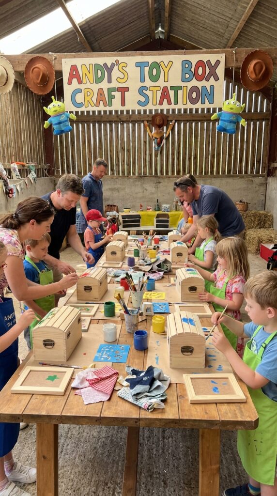 Don’t forget to set up a photo booth area with toy story props nearby—it’ll keep kids entertained between craft rotations. Stock up on construction paper, glue sticks, and scissors for endless creative possibilities.