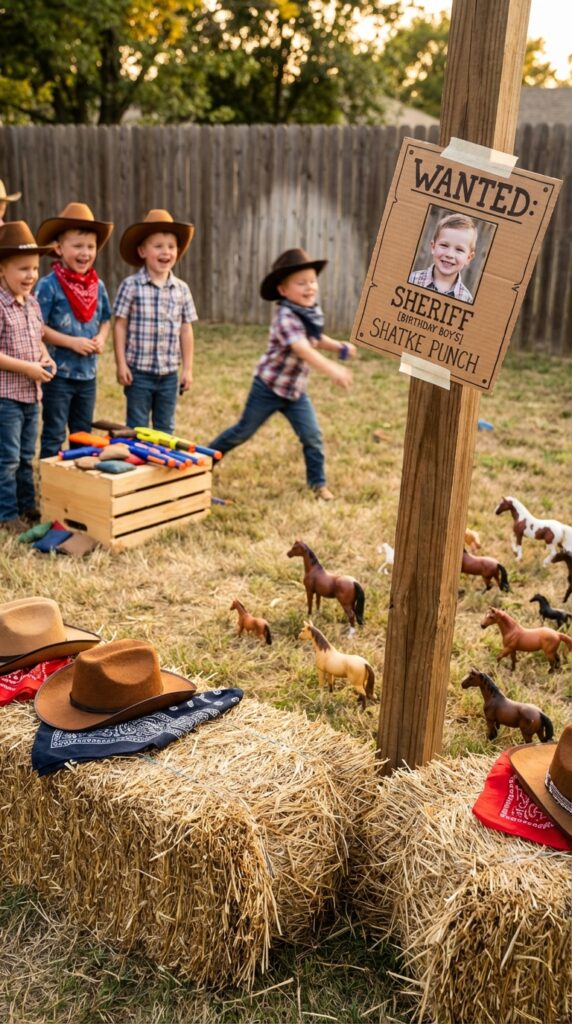 Build sheriff’s office centerpiece using cardboard boxes painted brown, complete with “WANTED” posters featuring the birthday child’s photo for that authentic Wild West feel.