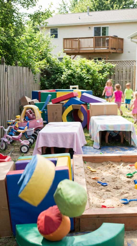 Design obstacle course challenges using colorful foam blocks for climbing walls and hula hoops as “escape tunnels.” Set up a sandbox station where kids crawl under tables draped with sheets.