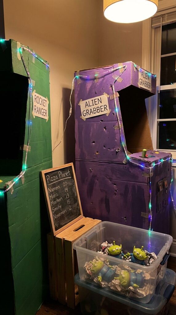 For game design, create simple activities like ring toss using glow sticks and plastic bottles. Add a “high score” leaderboard on poster board where kids can write their names. Don’t forget Pizza Planet’s signature green and purple color scheme throughout your arcade corner.