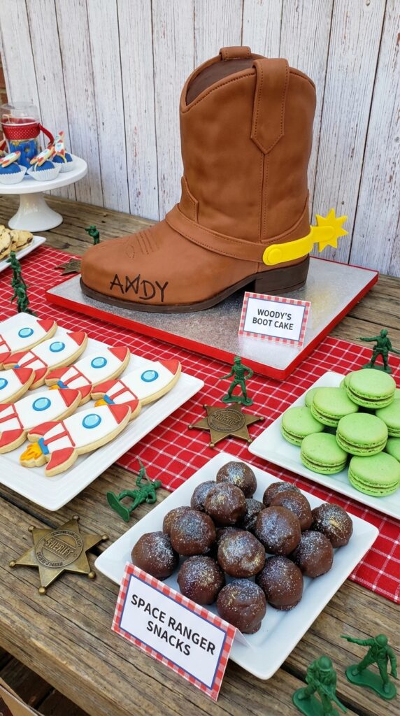 Create Woody’s iconic boot cake using a bundt pan—it’s surprisingly simple and incredibly impressive. Frost it brown, add yellow trim, and you’ve got Andy’s favorite cowboy’s signature footwear.