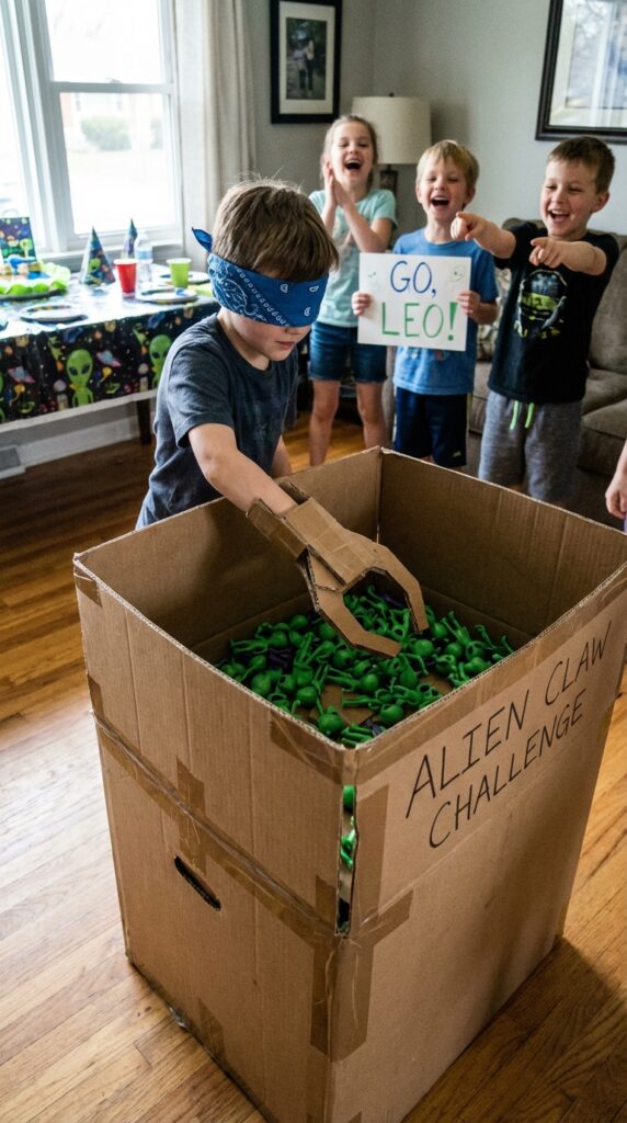 Transform a cardboard box into your own extraterrestrial retrieval contest. Cut arm holes and fill it with small alien toys and prizes. Kids take turns operating the “claw” – really just their hands – while blindfolded.