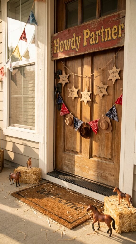 Position howdy partner welcome signs at your front door using rustic wooden boards painted in vintage Western fonts. I’ve found that cardboard works just as well if you’re budget-conscious.