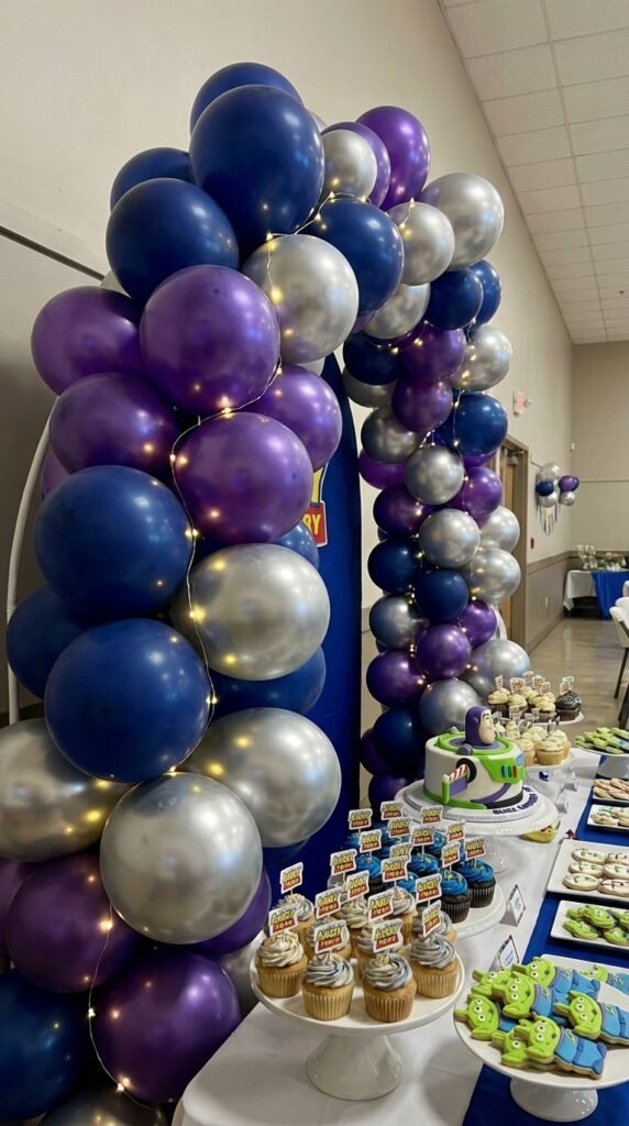 Here’s where magic happens: weave battery-powered LED lighting effects throughout your arch. These tiny lights convert ordinary balloons into twinkling stars, creating that otherworldly Buzz Lightyear atmosphere toddlers absolutely love. Position your arch behind the main party table for maximum impact.