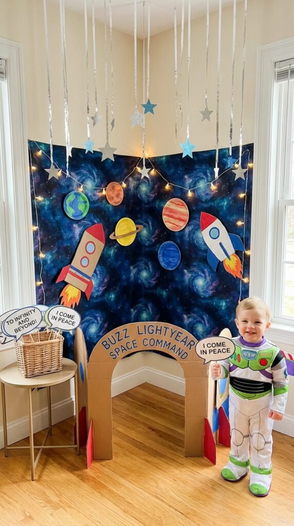 Create a backdrop using silver streamers and star cutouts. Position cardboard rockets and planet props at different heights for varied photo shoot angles. I’ve found that placing props at toddler eye-level works best.