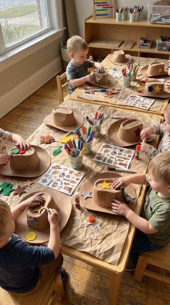 Set up two separate stations for maximum fun. At the first, provide plain brown paper cowboy hats with stickers, markers, and glue sticks. Trust me, toddlers love decorating their own wearable expert pieces.