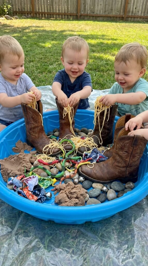 The classic Woody line “There’s a snake in my boot!” becomes pure toddler magic when you convert it into an interactive sensory experience. Fill large cowboy boots with different sensory textures like cooked spaghetti, rubber snakes, and smooth river rocks.