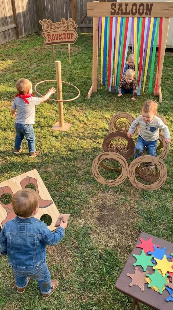 Set up stations like “lasso the toy horse” using hula hoops, crawling under “saloon doors” made from streamers, and hopping through “tumbleweeds” (cardboard circles). These obstacle course challenges keep little ones engaged while developing their coordination.