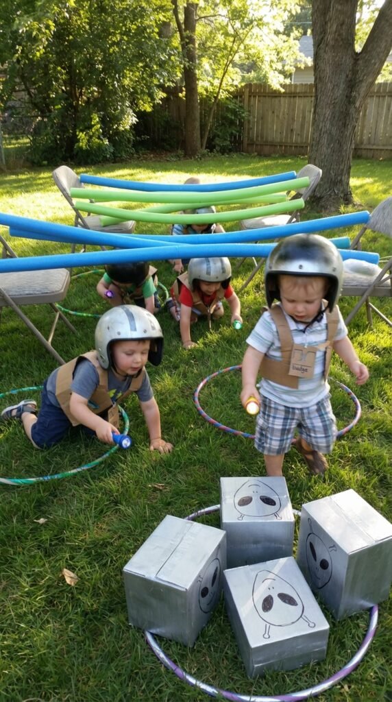 Set up a galactic obstacle course using pool noodles as laser beams to crawl under, hula hoops for “asteroid fields” to jump through, and cardboard boxes painted silver as alien spaceship targets. I’ve found that toddlers absolutely love the “laser tag” station—just use flashlights as lasers.