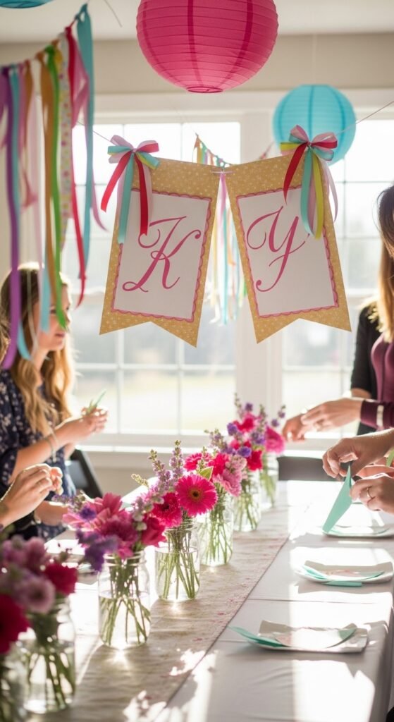 You’ll love double sided decorations – they’re genius for twin celebrations. Print banners and signs on both sides, then hang them strategically where guests can see them from multiple angles. This simple trick instantly doubles your visual impact.