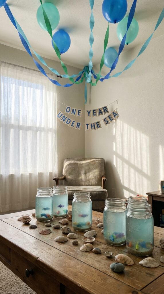 For easy DIY centerpieces, fill mason jars with blue-tinted water, plastic fish, and sand. They look stunning and cost almost nothing. You’re effectively bottling the ocean — and honestly, guests will think you hired a professional decorator. Budget-friendly never looked this good. For a more polished look, consider under the sea centerpieces that incorporate real sand, shells, and aquatic plants to bring an authentic oceanic feel to your tablescape.