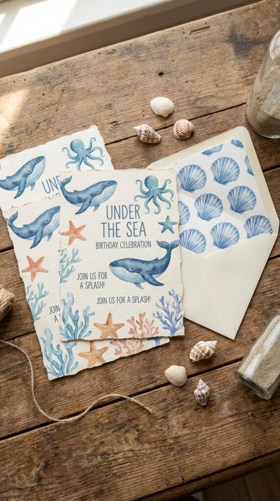 Before your guests even arrive, your invitation sets the entire mood for the party — so make it count. Choose custom invitation designs featuring watercolor sea creature motifs like jellyfish, starfish, or friendly crabs. These soft, artistic touches immediately signal the theme without feeling overwhelming.