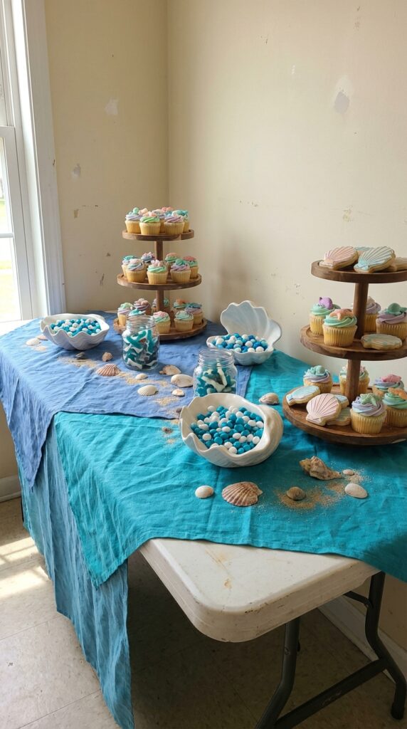 Setting up an ocean-themed dessert table doesn’t have to feel overwhelming — even a few simple touches can alter a plain folding table into something that looks straight out of a Pinterest board.