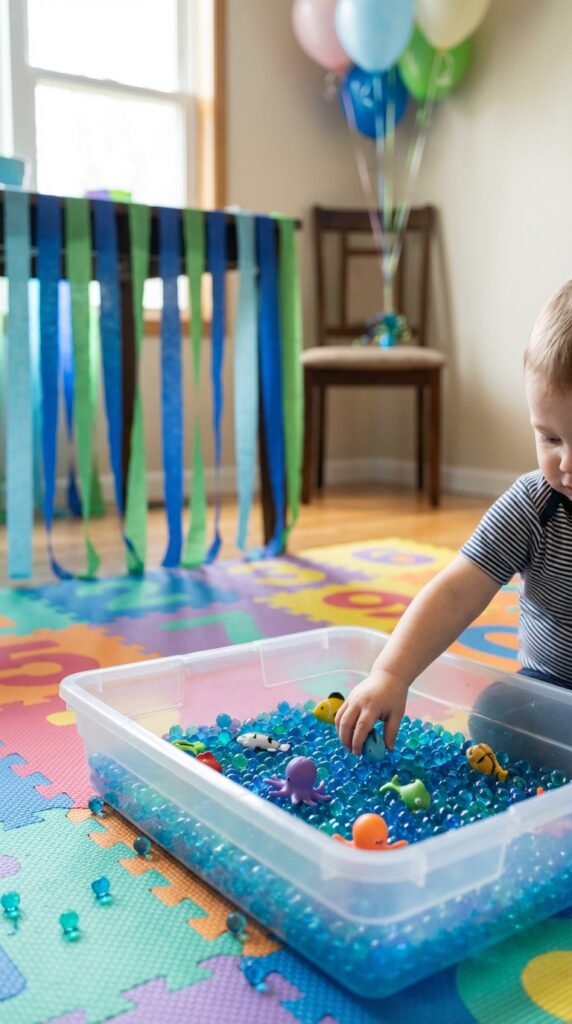 When you’re planning activities for a room full of one-year-olds, keeping things simple and sensory-focused is your best strategy. Skip elaborate plunge into games and instead set up a shallow sensory bin filled with blue water beads and plastic sea creatures. Babies love touching, grabbing, and exploring textures.