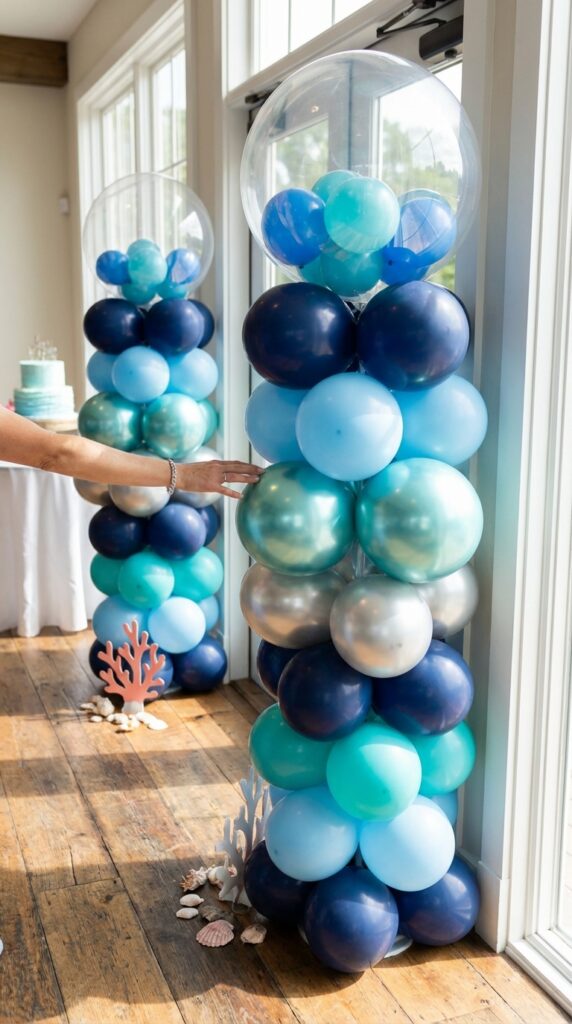Add clear balloons filled with smaller blue ones to create stunning bubble effects throughout each column. Metallic finishes in aqua or silver catch light beautifully, mimicking sunlight filtering through water. Place columns near your entrance or cake table for maximum impact. Trust me, guests notice them immediately. For an even more immersive look, pair your balloon columns with deep-sea themed decor like coral centerpieces and seashell accents to bring the entire ocean atmosphere together.