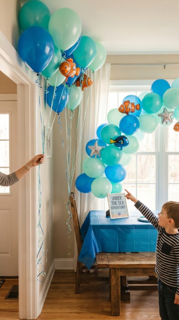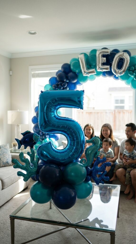 You can even take it further with personalized balloon sculptures that incorporate the birthday kid’s name alongside ocean-themed characters. These arrangements photograph beautifully and double as a natural backdrop for the cake table. Trust me, guests will stop and stare before they even notice the decorations around it.