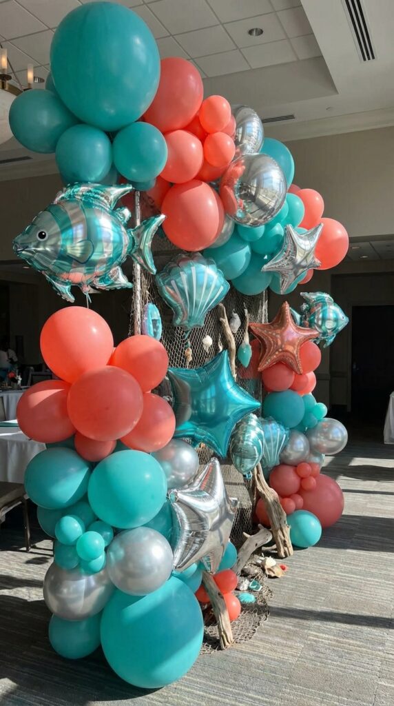 Foil balloons shaped like fish, shells, or starfish add metallic balloon accents that shimmer beautifully against matte latex clusters. Try pairing teal and coral latex balloons with silver or holographic foil ocean shapes.