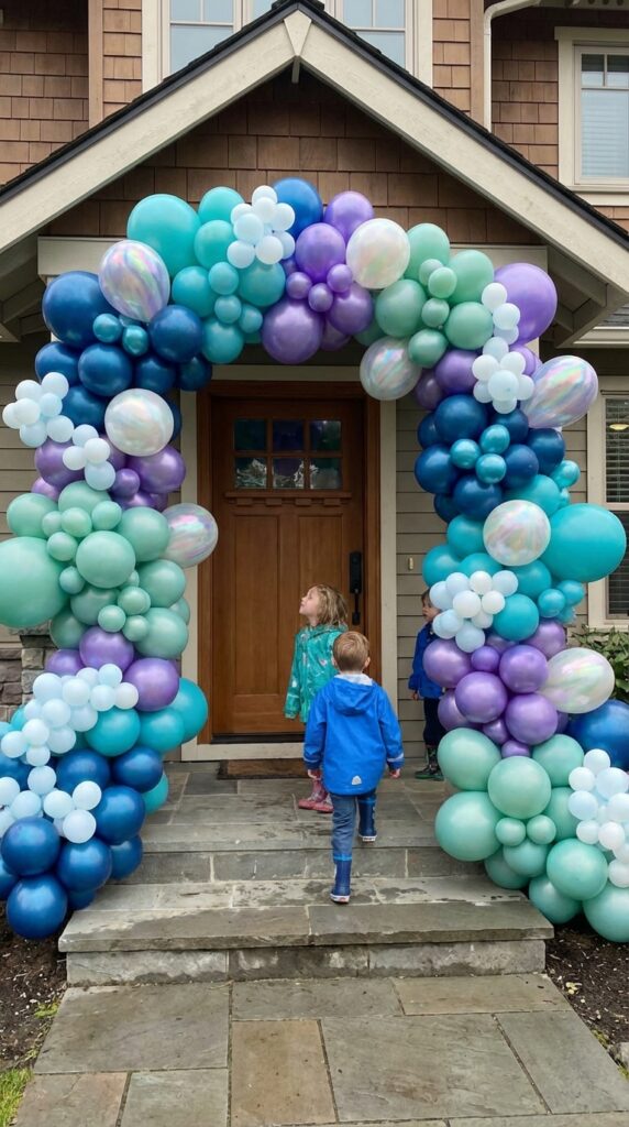 Imagine stepping through a doorway that suddenly feels like the entrance to an underwater cave — that’s exactly what a well-built balloon arch can do. Use deep blues, teals, and purples to build your frame, then weave in bubble arch designs using round clusters that mimic floating sea foam.
