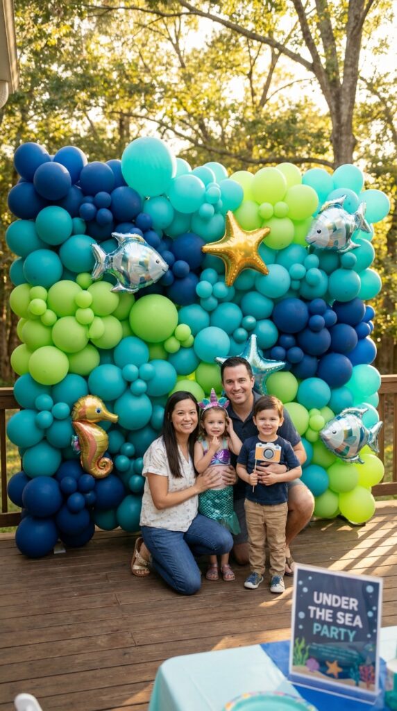 Building an undersea balloon wall sounds like a big project, but it actually comes together faster than you’d expect — and the payoff is massive. Aim for a balloon backdrop size of at least 6 feet wide so everyone fits in the frame comfortably.