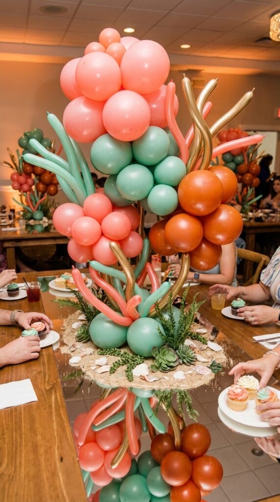 Coral reef centerpieces might sound complicated, but balloon clusters make them surprisingly easy to pull off. Arrange balloon clusters in lively colors like coral pink, seafoam green, and deep orange at each table’s center. Stack them at varying heights to mimic the natural, layered look of a real reef.