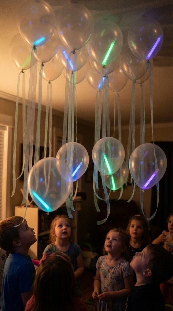 Few decorations steal the show quite like floating jellyfish balloons drifting across your ceiling. You’ll create these by attaching ribbon streamers underneath clear or translucent balloons, mimicking those dreamy ocean creatures. Luminous balloon jellyfish work especially well when you add glow sticks inside, making them shimmer beautifully in dim lighting.
