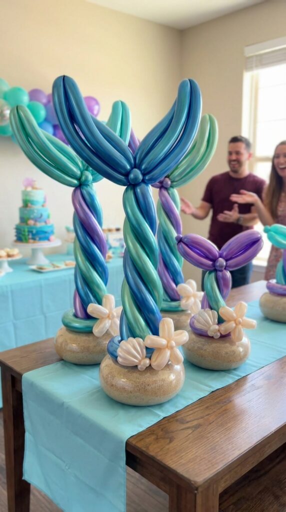 While your jellyfish balloons handle the ceiling, your party table deserves its own showstopper — and mermaid tail balloon sculptures deliver exactly that. These unique balloon sculptures create stunning centerpieces that guests actually stop and admire.
