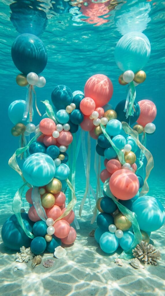 Don’t sleep on metallic gold accents either. They mimic sunlight filtering through water beautifully. Avoid muddy brown or dull gray tones since they flatten everything visually. Your goal is brightness, movement, and that magical underwater glow throughout the entire setup. Complement your balloon arrangement with decorative shells and streamers to reinforce the immersive ocean atmosphere from every angle.