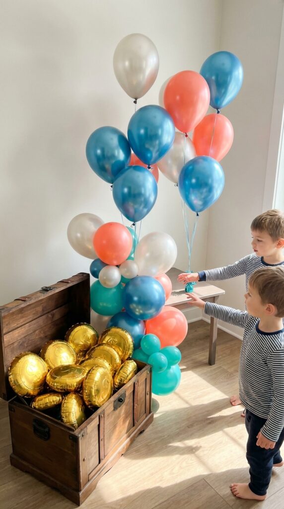 Imagine anchoring your entire balloon display around a gorgeous treasure chest centerpiece — it honestly alters a simple balloon bouquet into a full storytelling moment. For treasure chest decorating, surround it with gold, pearl, and deep ocean blue balloons. Stack them in varying heights for visual depth.