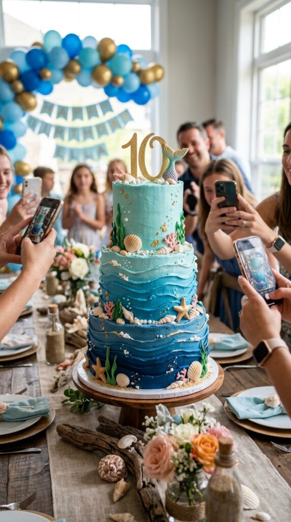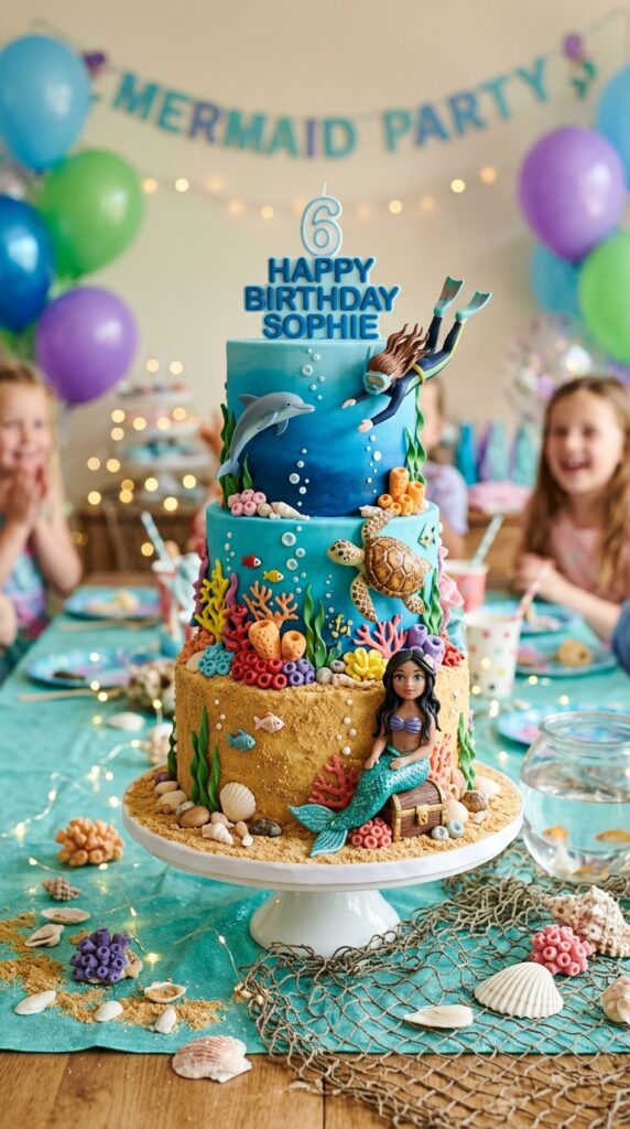 Trust me, parents will be snapping photos before anyone even thinks about cutting a slice. To complete the enchanting look, coordinate the cake with ocean-themed costumes for the birthday star and guests, tying the entire celebration together seamlessly.