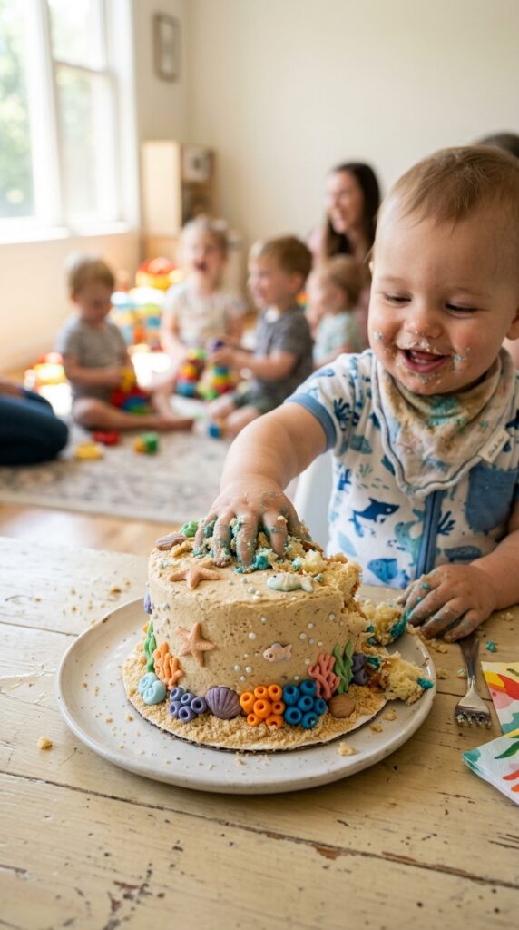 You can also order personalized sea creature cakes featuring their name alongside a custom octopus or seahorse. Keep portions small, frosting light, and decorations baby-safe. Trust me — watching a one-year-old take down an adorable mini ocean cake is pure birthday magic.