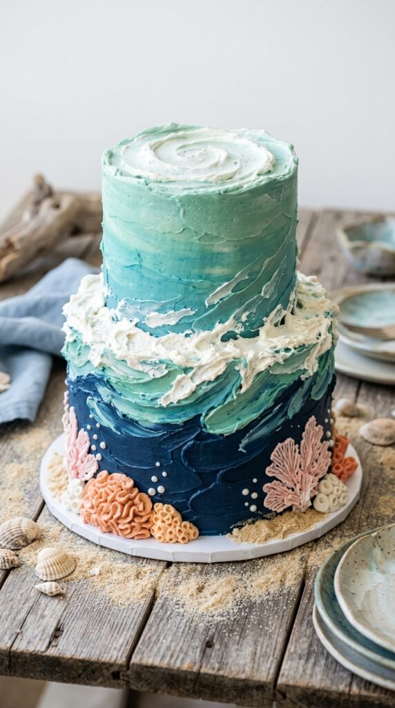 Stack two or three layers, then decorate each one with a different ocean zone — sandy bottom, coral reef, open water. It creates a stunning visual story guests will photograph before they consume it.